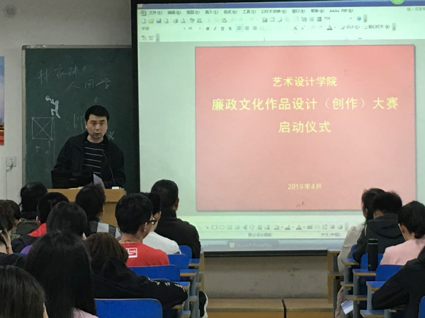 为更好地推进反腐倡廉宣传教育工作,提高广大师生廉洁意识,端正教风、学风和工作作风,加强“三风”建设,营造校园风清气正的育人和工作环境;“艺术设计学院廉政文化作品设计(创作)大赛”活动启动仪式于2018420日下午在艺术楼309教室举行。视觉传达设计、美术学等专业的部分学生代表参加了此次启动仪式。此次大赛鼓励同学们采用绘画作品、书法作品、摄影作品、宣传招贴、篆刻、民间美术、数码艺术、陶艺、纸艺、微电影、动画和漫画等作品形式进行创作,表现反腐倡廉这一主题。