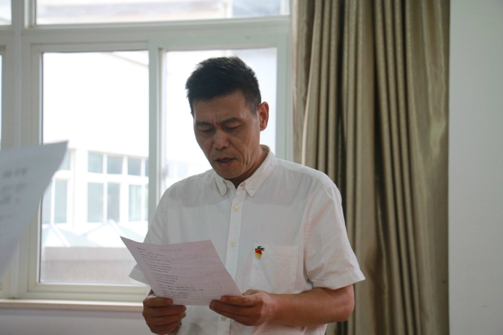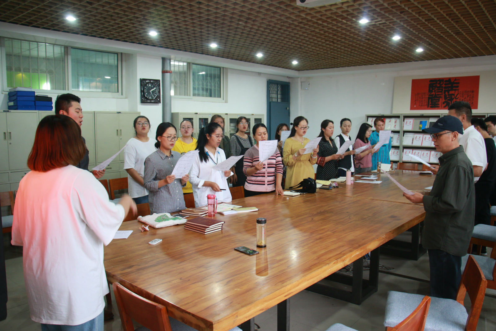 活动开始,学生会成员分别给在座的老师发放歌谱;接着由大一新生歌唱团代表为全体教职工老师做示范;并通过播放音频,现场领唱等方式对老师们进行教唱。