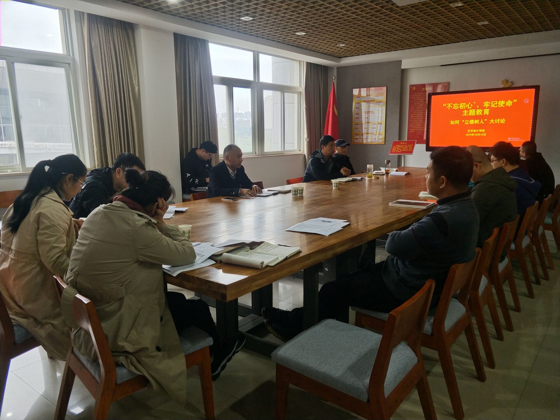 为深入落实“不忘初心、牢记使命”的有效推进,加强教师党员的教学方法,师资力量、团队力量的建设,10月15日下午在306会议室展开了如何“立德树人”大讨论。参加此次会议的有艺术设计学院院长梁立民、党总支副书记吴国华、副院长李伟力和全体教职工党员。