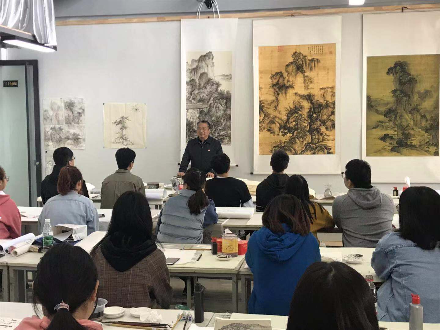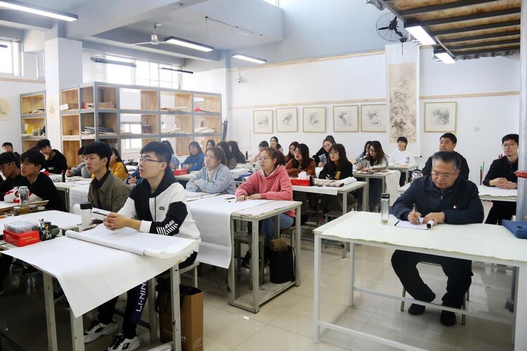 随后,李国胜深入课堂一线开展调研,听取了李楠老师讲授的《山水画的透视方法》课程内容,李国胜在听课过程中,认真记录,细心观察学生听课和学习状态,对教师的教学准备、教学内容、教学方法、教学效果、课堂管理等情况进行了解。课堂上,李楠老师讲述了山水画透视的六种方法以及中锋用笔方法。理论教学讲完后,李楠老师又用30多分钟时间开展实践教学,采用郭熙的《早春图》与同学们进行了教学实践互动,深刻剖析山水画透视的六种方法运用。在听取了李楠老师的课程后,李书记作了点评,他认为李楠老师的课上得非常好,深入浅出、授课形式多样、课堂内容充实、专业功底深厚,并告诉同学们,李楠老师对绘画的热爱、学习态度、专业精神值得同学们学习,勉励同学们只有用这种敬业态度对待绘画,将来才能在绘画上有所造诣。李国胜最后激励同学们要将专业知识与实践相结合,用李楠老师的专业态度对待学习,刻苦锻炼,努力提升自己的知识水平和实践能力。温暖的话语,让同学们感动不已,同学们纷纷表示将认真学习专业知识,丰富大学学习生活。