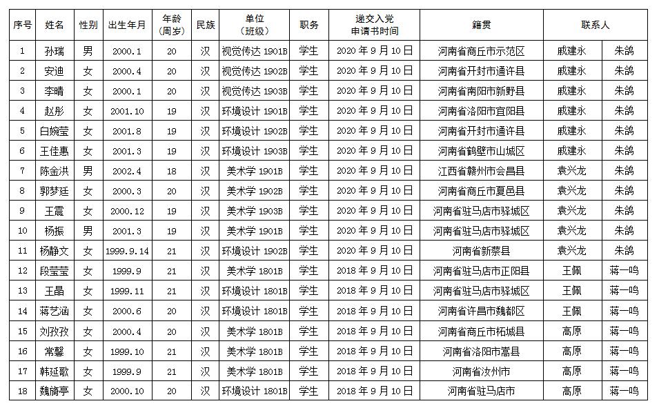 依据《中国共产党发展党员工作细则》和《黄淮学院发展党员工作实施细则(修订)》的要求,艺术设计学院党总支严格按照《关于实行“双推双评三全程” 进一步规范发展党员工作实施办法》规定的程序和标准,贯彻落实中共黄淮学院委员会组织部关于印发《2020年度第二期入党积极分子集中培训方案》的通知精神,在已递交入党申请书一个月以上的人员中,通过“双推”“双评”,认真讨论表决,确定入党积极分子人选,现对确定的人选进行公示。