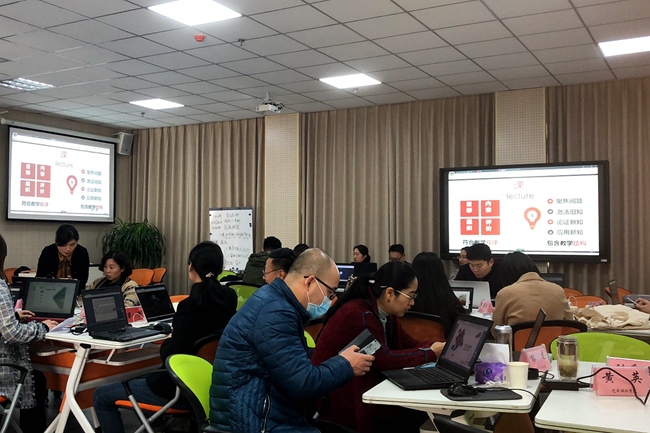 培训团队从信息时代教学生态的变化为引入,根据一线教师建设在线课程的需求,手把手教授SPOC在线课程建设、应用和微课制作以及移动教学方法。老师们在培训中自己动手操作,培训者现场指导,并对完成的初步作品分组进行展示和交流,分享制作经验,最后以“超星学习通”为例,大家现场建立课程框架并尝试了课程应用。