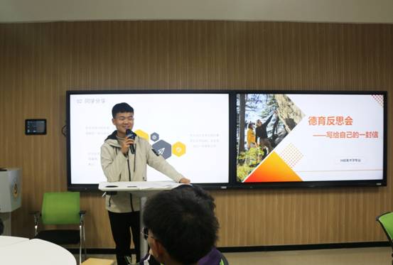 本期“德育反思”班会由“写给自己的一封信”活动拉开序幕,同学们端坐在课桌前沉思静想,拿起纸笔为自己写下一封信。接着,通过抽签的方法来随机邀请同学向大家分享自己的信件。美术学专业2001B班读信人有的有的认真深刻,有的激情澎湃,有的志气高昂,也有的风趣幽默……在每一封信中,都充满着写信人对自己更好的的期待和憧憬。同学们一次又一次的掌声也传递出同学们相互之间的关心和鼓励,班级的凝聚力也在潜移默化地提升。