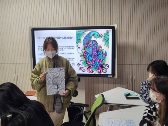 活动开始前,袁老师向同学们介绍了朋辈的概况以及团辅活动的意义。在之后的活动中,袁老师通过小组讨论、交流分享等形式让同学们明白了什么是禅绕画以及禅绕画的意义。也让参与活动的同学用禅绕画的方式来释放出压力,放松身心。在最后的环节,同学们展示了自己的禅绕画,并分享自己在制作禅绕画的过程中有什么样的感受。活动结束后,同学们纷纷表示受益匪浅,为解忧舒压找到了一种新的形式。