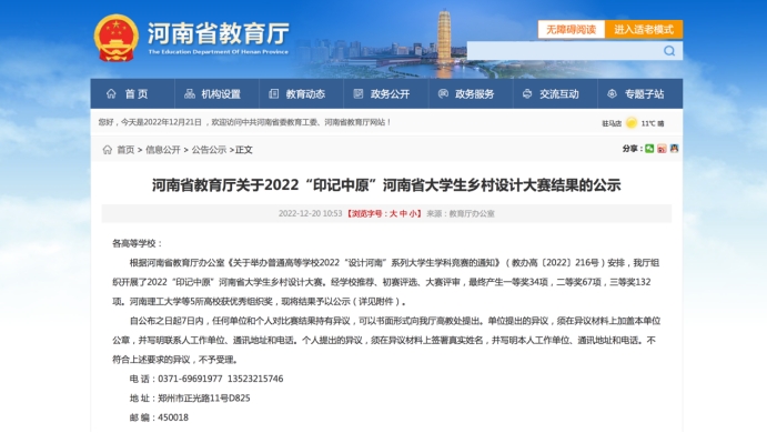 近日,普通高等学校2022“设计河南”系列大学生学科竞赛之“印记中原”河南省大学生乡村设计大赛圆满落幕。经学校推荐、初赛评选、大赛评审,艺术设计学院选派的师生团队在此次大赛中共斩获一等奖3项,二等奖2项、三等奖10项并获优秀组织奖。