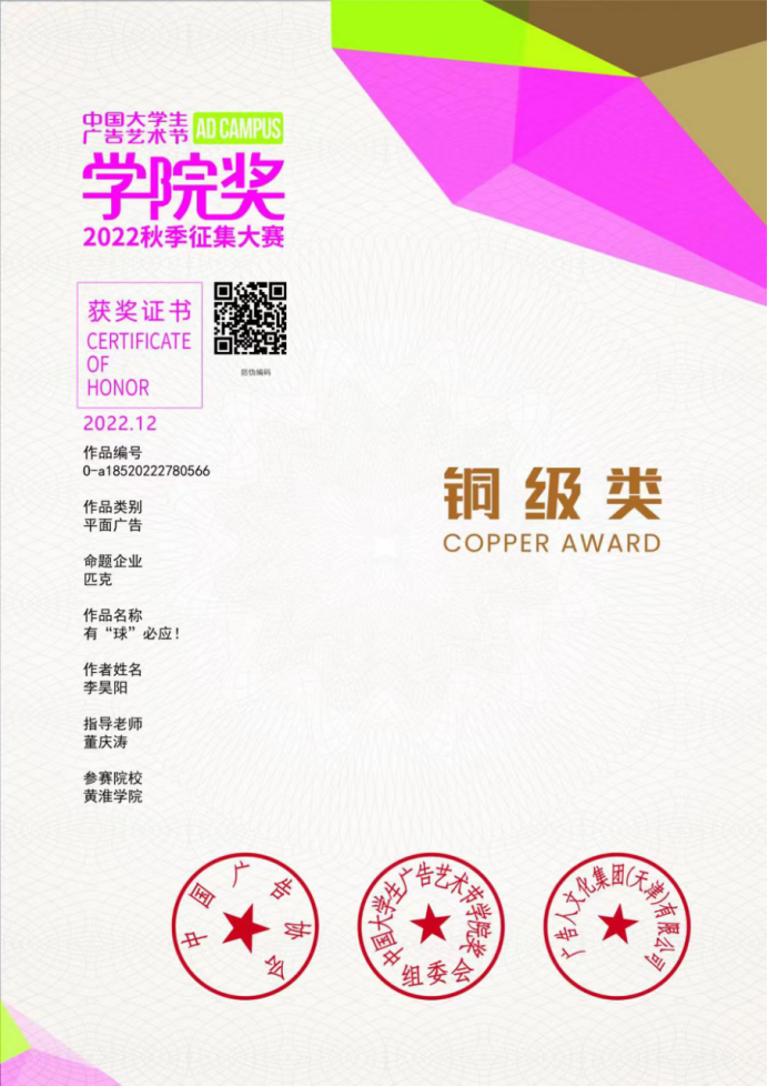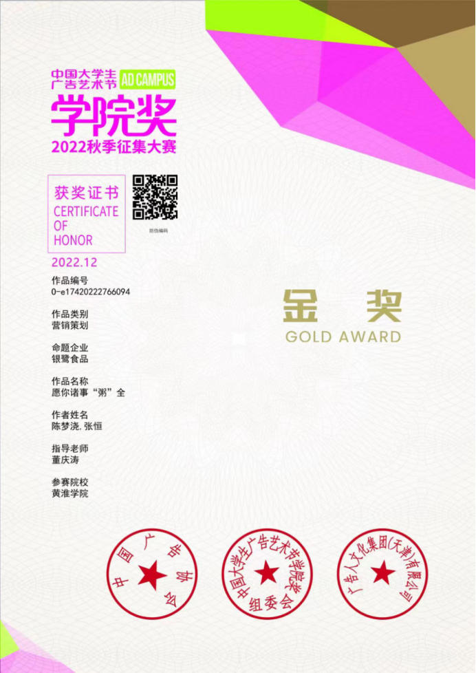 近日,第29届中国国际广告节暨中国大学生广告艺术节在厦门国际会展中心成功举办,我院学生参加现场颁奖典礼,在此项赛事中,我院参赛学子捷报频传,艺术设计学院团队精心准备,陈梦浇团队《愿您诸事“粥”全》获金奖,李昊阳团队《有“球”必应》获铜奖,其他优秀入围奖28项,董庆涛、朱鸽老师获得优秀指导教师奖。