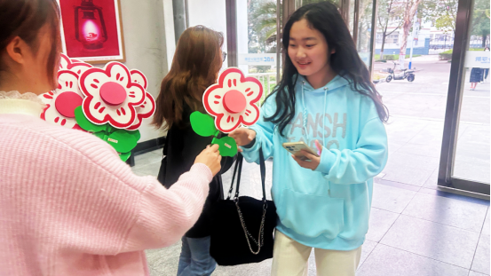 为庆祝三八妇女节,活跃校园文化氛围,引导女大学生关爱自身、关爱他人,38日上午,艺术设计学院在教学楼开展了“送你一朵小红花”暖心活动。