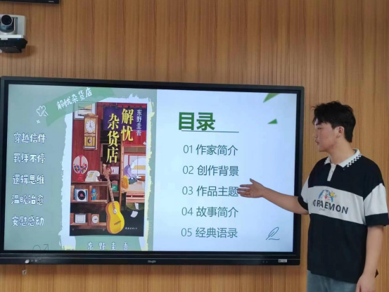 主讲人带领同学们一起进入故事情节:在僻静街道旁的一家杂货店,只要写下烦恼投进店前门卷帘门的投信口,第二天就会在店后的牛奶箱里得到回答。因男友身患绝症,年轻女孩月兔在爱情与梦想间徘徊;松冈克郎为了音乐梦想离家漂泊,却在现实中寸步难行;少年浩介面临家庭巨变,挣扎在亲情与未来的迷茫中……这不仅是一部关于人情世故的小说,更是通过一个卖杂货的老板在处理顾客烦恼的过程中揭示人性之美的故事。同学们讨论,这是一本有温度的书,它用善的温情施行了爱。