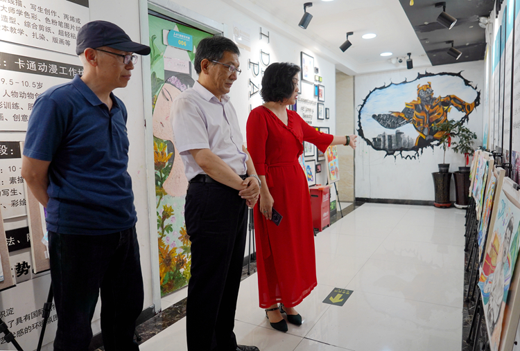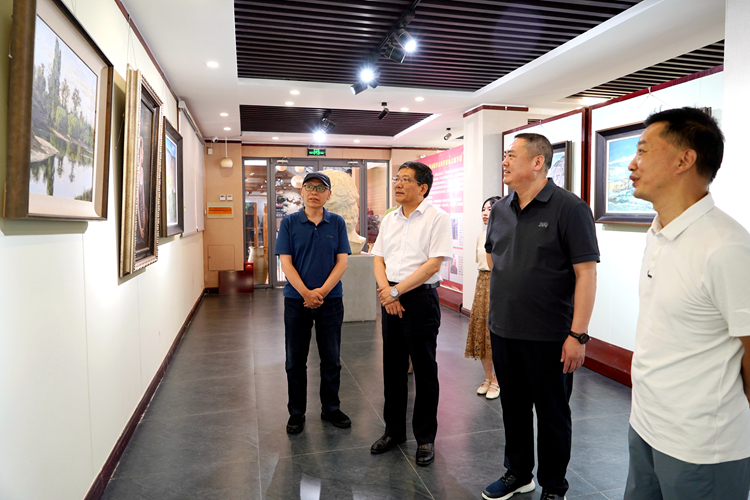 王冰一行首先来到天中油画院和天中美术教育中心,在负责人马鹰的陪同下,实地考察中心的展馆,培训教室和工作室等场所,与相关人员深入交流,了解企业的发展及人才需求。