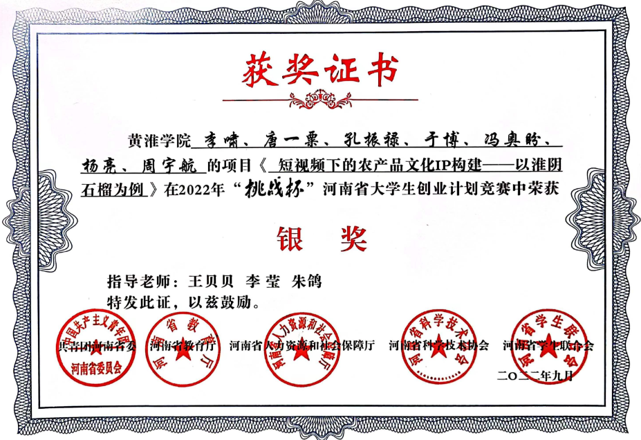 、《短视频下的农产品文化IP构建--以淮阴石榴为例》《基于乡村振兴视角下确山县农产品红色基因包装策略探究》等项目的研究,并参加了“挑战杯”“互联网+”等创新创业比赛,并获得了优异成绩。