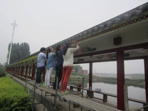炎热的夏日如期而至,但酷暑不能阻挡同学们实践的热情,在黄淮学院快速发展,优化转型的大背景下,我院美术学1103B李云鹏、张路军、杨璐、宁欢、黄古月、许晓凡等同学在范军老师的指导下,在练江滨河公园文化长廊进行艺术彩绘,提升公园文化氛围,打造驻马店新形象。