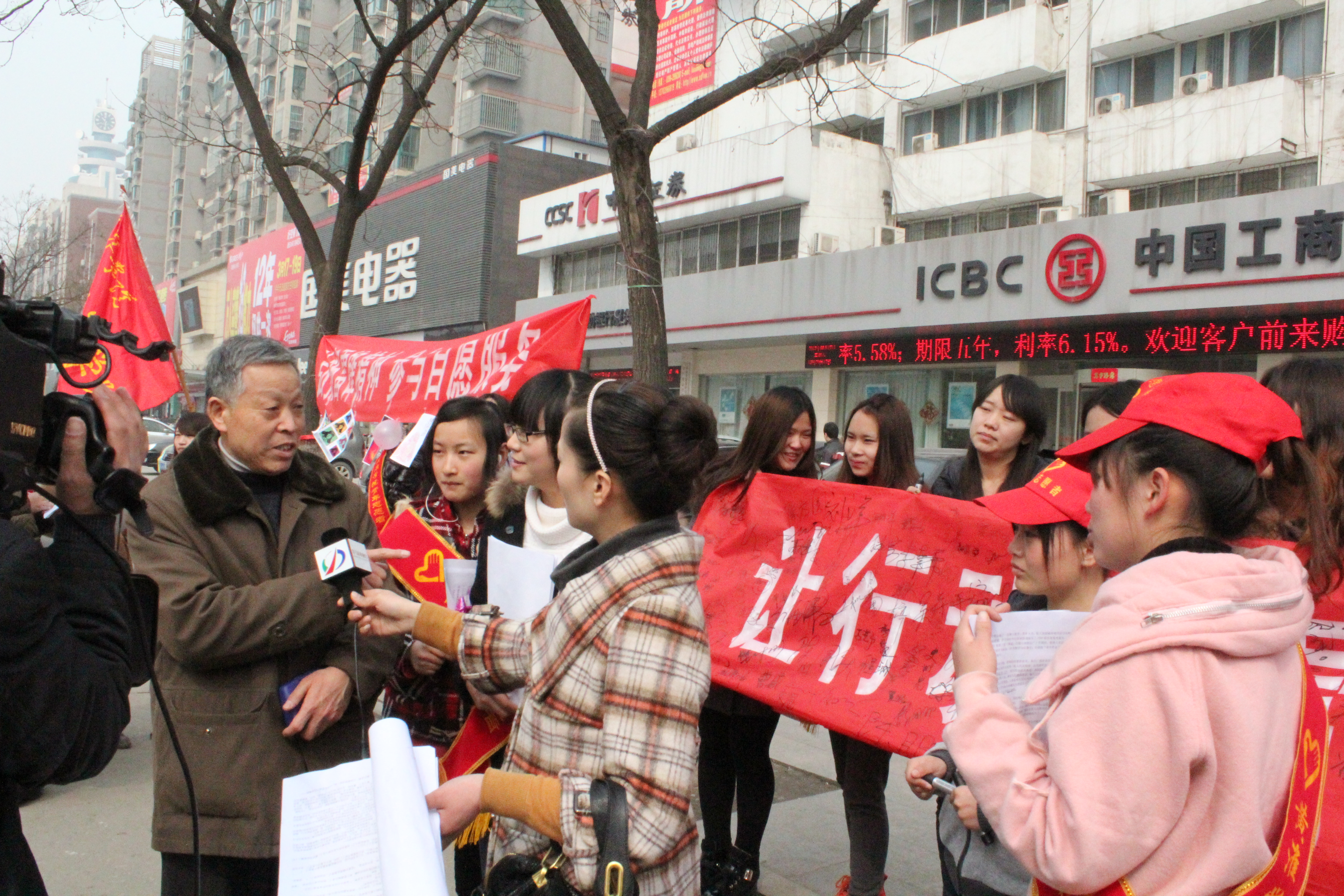 我院艺术设计学院艺术设计10级党团员于3月17在市解放大道工商银行前举行了“学习雷锋精神 参与自愿服务千人签字/涂鸦”活动。活动现场,同学们用自己精心制作的不同时期的雷锋肖像手工制作的折纸花束来装饰现场。负责雷锋生平事迹宣传的同学对雷锋事迹的进行讲解,并提供了市民抒发感言和随意涂鸦的文具和条幅。得到了广大市民的关注和好评并受市电视台的关注。<?xml:namespace prefix = o ns = "urn:schemas-microsoft-com:office:office" />