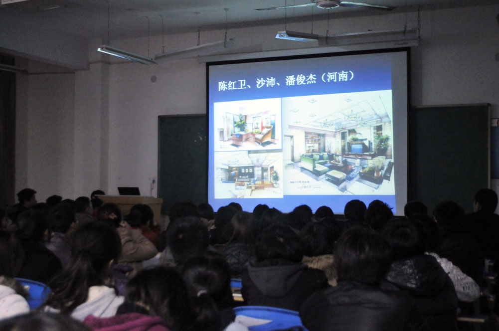 秦老师用生动幽默的言辞向与会者讲述了手绘的重要性及其意义、手绘的方法、目前国内手绘设计的几个派别等几大部分和设计者的选择、设计积累、设计创造过程。并通过现场互动、有奖问答的形式细致的讲解了设计者需要具备的各种能力。秦老师还即兴演唱了两首流行歌曲,把整个讲座推至高潮,最后对同学们提出了更高的期望,希望他们选择自己的目标,持之以恒。陈向阳老师对此次讲座做最后总结,希望大家以此激励,奋发图强,将来都能成为优秀的设计师。
