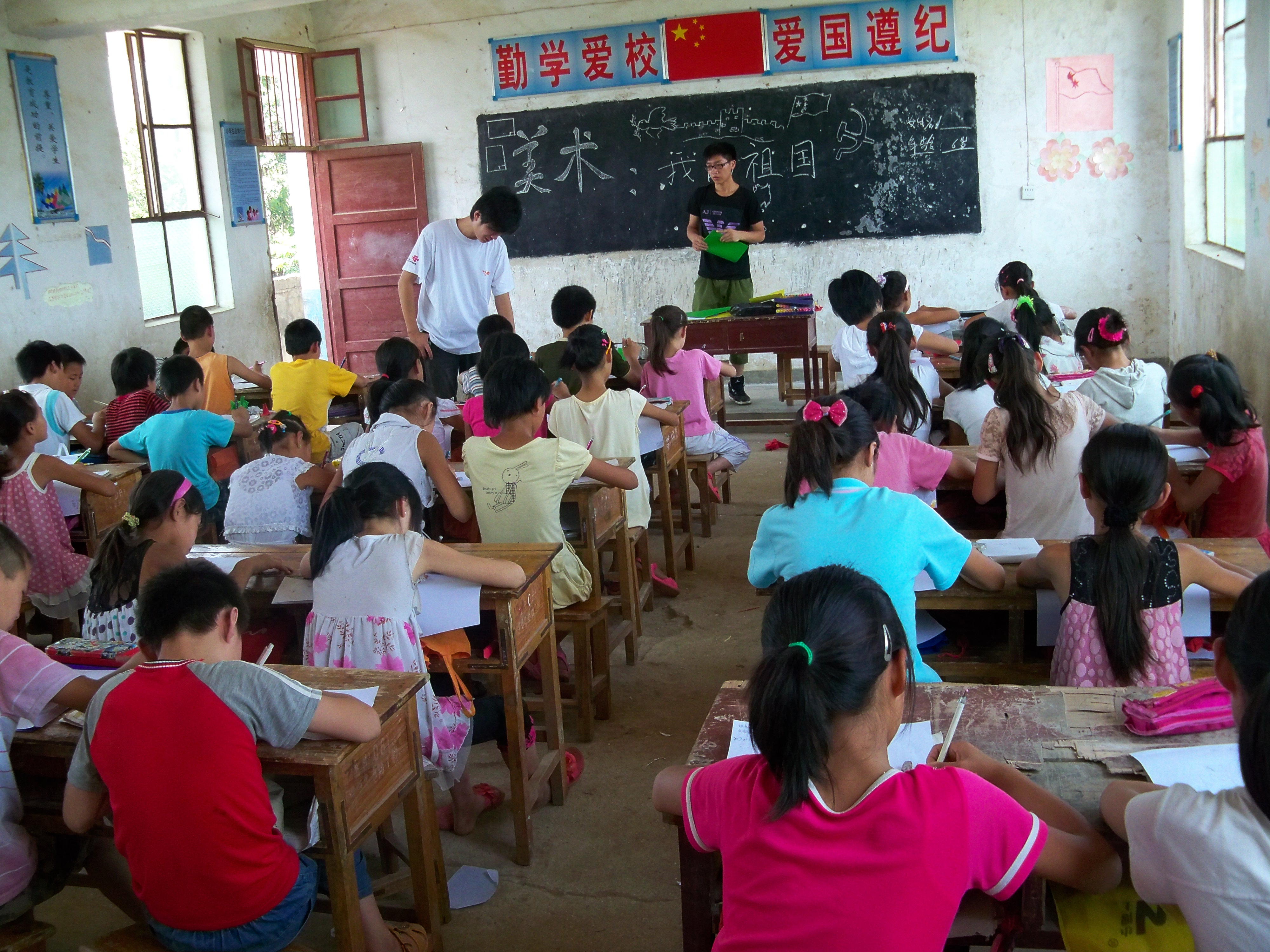 确山县石磙河镇地处确山县西部,经济基础相对薄弱,教育水平相对落后,学生上课时基本上没有开过美术课。针对石磙河镇何大庙村的这个现状,美术系“艺术支教帮扶团”特别安排了美术课,充分发挥美术系学生的优势,给何大庙村的革命后代们辅导美术课,挖掘孩子们的艺术潜质,为今后的学业发展方向提供更多的帮助。