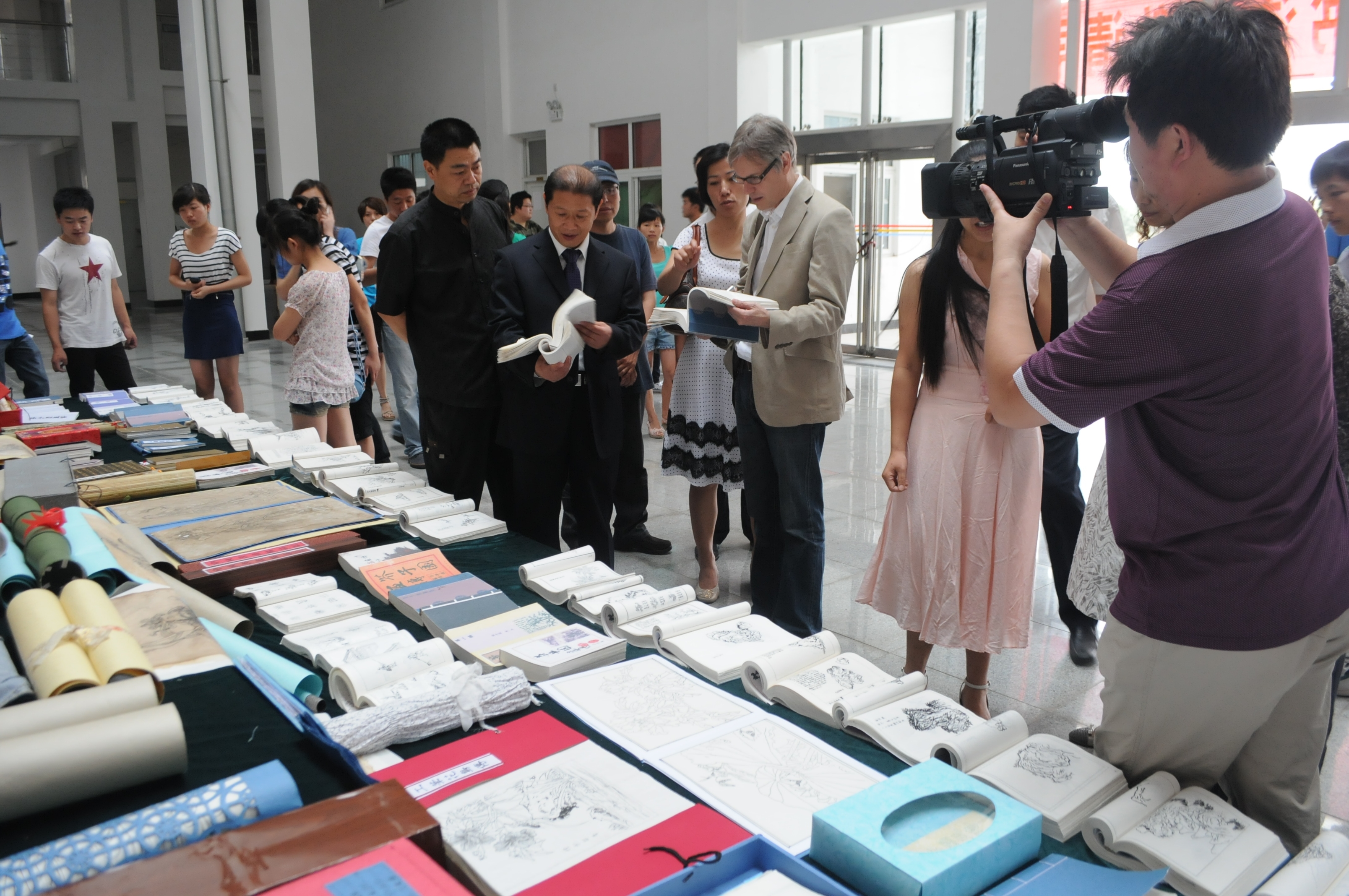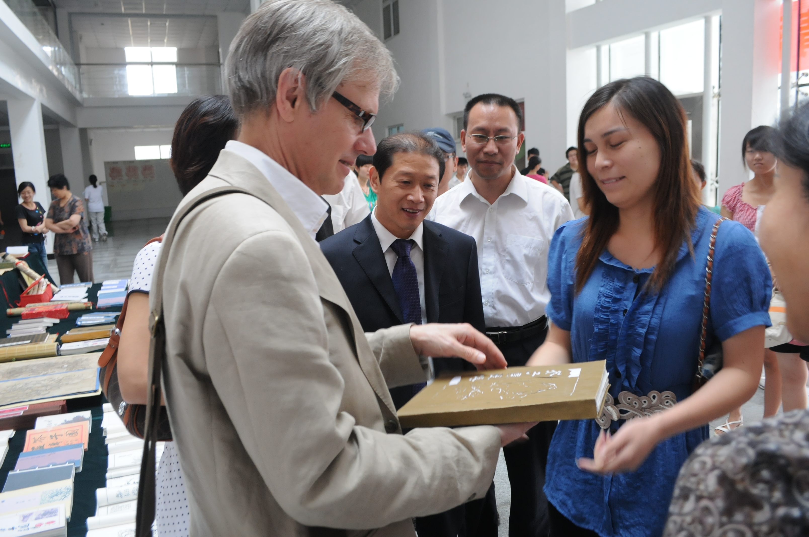 Aled Jones 教授对学生手工制作的作品集给予高度评价并高兴的接受了学生赠送的自制的作品。在参观了书法展后,他对中国书法艺术、印章艺术也表现了浓厚。