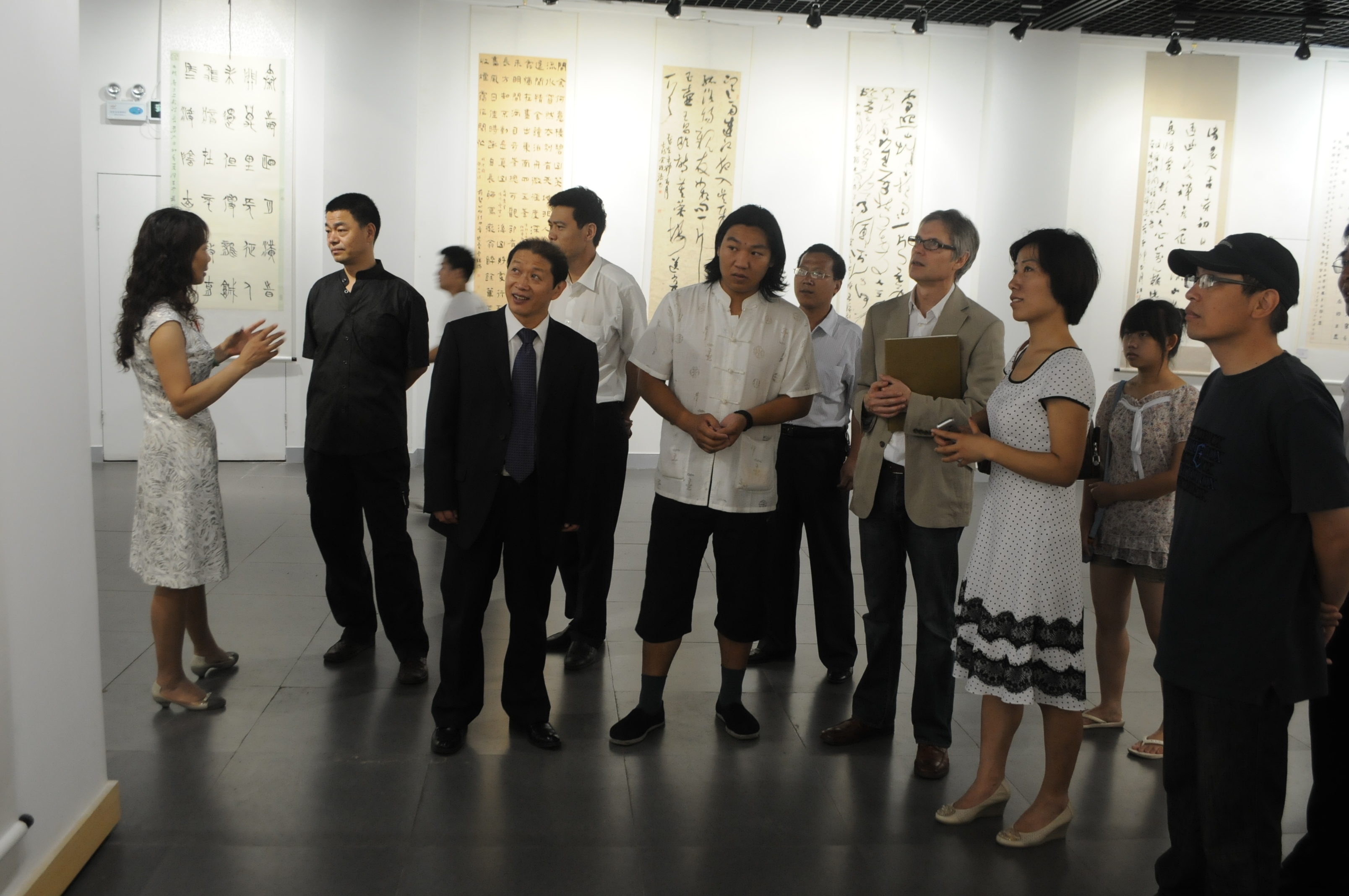 14日上午,英国阿伯瑞斯特维斯大学副校长Aled Jones 教授一行三人在校长介晓磊、副校长谭贞和教务处、国际交流合作处、国际学院等相关部门负责人的陪同下参观美术系学生中国画作品展及全国百名知名书法家邀请展。
