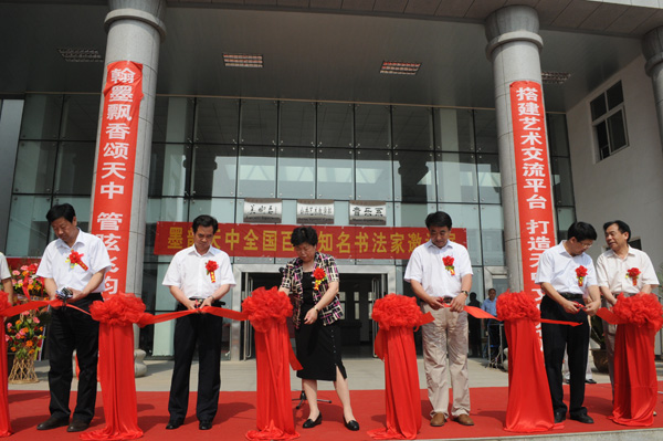 为庆祝中国共产党成立90周年,繁荣天中书法艺术。 6月9日上午,“墨韵天中----全国百名知名书法家邀请展”在黄淮学院美术馆隆重开幕。参加开幕式的领导有市委常委、宣传部部长赵焕之,市人大副主席张杰,市政协副主席阎超、黄淮学院党委书记景照辉、院工会主席牛耀堂,以及《书法导报》、《书法报》、《青少年书法》、当代书法网以及我市主流媒体和社会各界人士、学院师生600余人出席了开幕式。