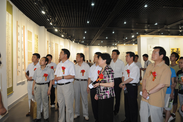 开幕式由市文联主席程书援主持,开幕式上宣传部部长赵焕之首先代表市委、市政府对这次在我市具有里程碑意义的文化盛会的开幕表示衷心的祝贺,对市文联和市聂政书法工作室为庆祝中国共产党成立90周年而举办的这次活动予以充分肯定。她说,天中历史源远流长,天中文化伟岸厚重。辉煌灿烂的天中文化是黄河文化、中原文化的重要组成部分,这里也因此而成为华夏文明的重要发祥地之一。早在周成王时驻马店就有天下之中之称,据《周礼·地官司徒》载:“周公营洛,以土圭之法测土深,正日景,以求地中。汝尤为豫州之中,故聚土垒石以标天中。”唐代大政治家、书法家颜真卿在此留下“天中山”手书真迹。自汉高祖四年置汝南郡以来,这里历代都是郡、州、府的治所,是豫南一带政治、经济、文化中心。这片土地曾经哺育出秦丞相鲁斯、著名发家代表人物韩飞、《盐铁论》的编著者桓宽、伟大的无神论者范缜等一大批历史文化名人。近代,这里走出了抗日民族英雄杨靖宇,在中国革命史上享有“小延安”之誉的确山县竹沟镇曾是中共中央中原局所在地,留下了刘少奇、李先念、彭雪枫等老一辈无产阶级革命家的战斗足迹。