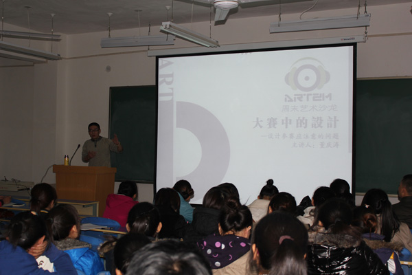 为提高学生的参赛意识,增强学生的创新能力,11月26日晚在5号楼51309教室举行了“周末艺术沙龙——大赛中的设计”的讲座,由董庆涛老师主讲。<?xml:namespace prefix = o ns = "urn:schemas-microsoft-com:office:office" />
