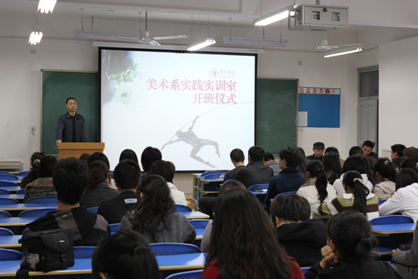 首先,梁立民主任就我国高等美术教育发展及我系美术专业的发展等方面,发表了自己独特的见解和想法,并强调实训室旨在提高研究层次,建立精英团队,鼓励学生多创作一些好的作品,成为设计团队中出色的一员,同时对上学期美术创作研究会取得的成绩进行肯定,指出了相关问题;随后,刘红伟老师宣读实践实训室方案,就实训室目标、要求、成果、类别、教师职责、学生职责进行了简要说明;李伟力主任宣读实训室老师及学生名单,系领导梁立民和李伟力发放了教师聘书;教师代表李楠和董庆涛分别作了发言,他们对自己成为实训室这个“尖刀班”中的一员感到荣幸,要以执著的精神去感染学生;学生代表张俊洋作了发言,他坚信实训室的学生在老师的指导下将会取得优异的成绩;最后,李伟力主任作了总结发言,希望老师多一份责任心,学生刻苦努力、一丝不苟创作出好的作品。