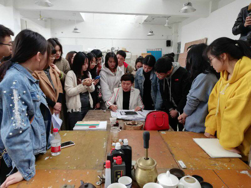 3月27日上午11点,张老师刚一到艺术设计学院,没来得及休息就开始给师生们看创作作品,针对作品中存在的问题真诚地提出意见并进行交流。