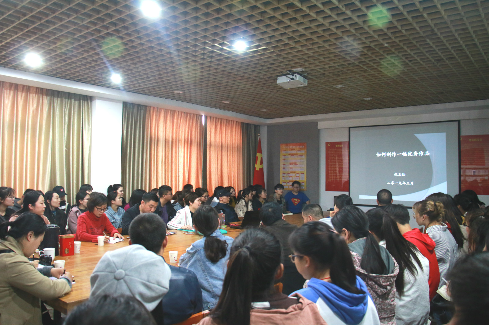 2019年3月27号下午2:30,艺术设计学院会议室里被挤得水泄不通,连门口都站满了人。发生了什么事?原来这里正在进行一场关于“如何创作一幅优秀作品”的讲座。