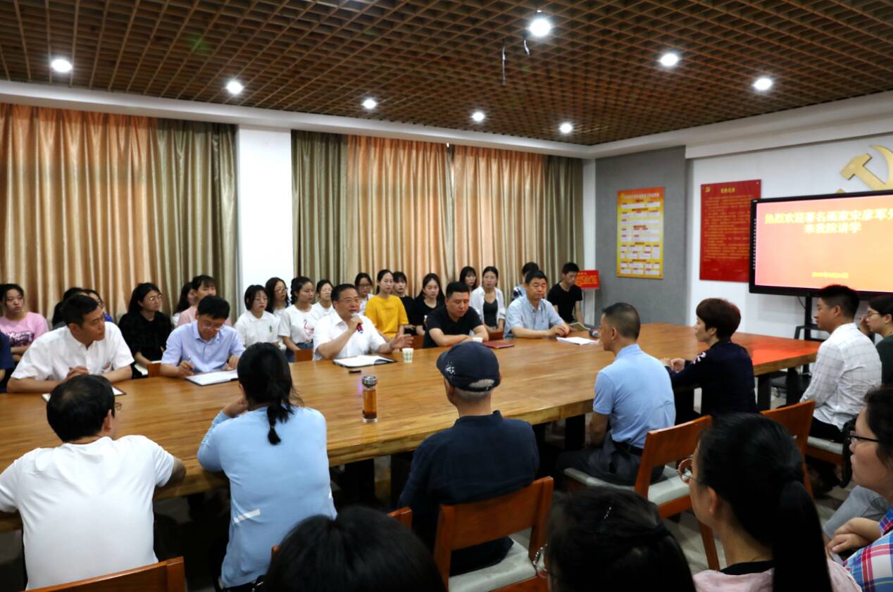 为提高我院教学质量,5月24日上午,在党委书记李国胜的邀请下,中国美术家协会会员、中国艺术研究院创作研究员、著名工笔画画家宋彦军来我院做讲学。出席此次讲学的有黄淮学院党委书记李国胜、副校长王东云、院长梁立民、党总支书记李信生等领导,栗东旭老师、丁烨老师等,大一全体美术学学生。此次讲学由梁院长主持,于306会议室举行。