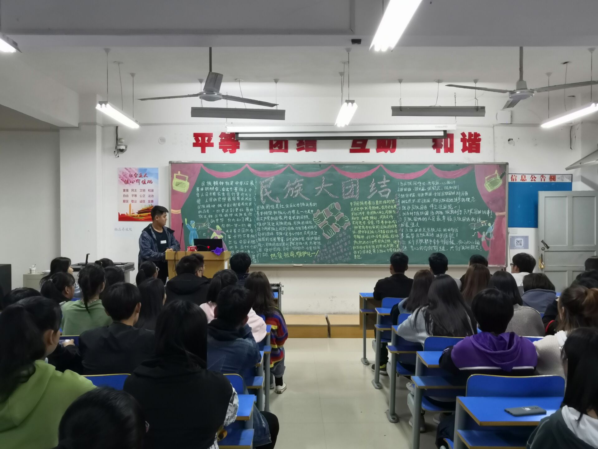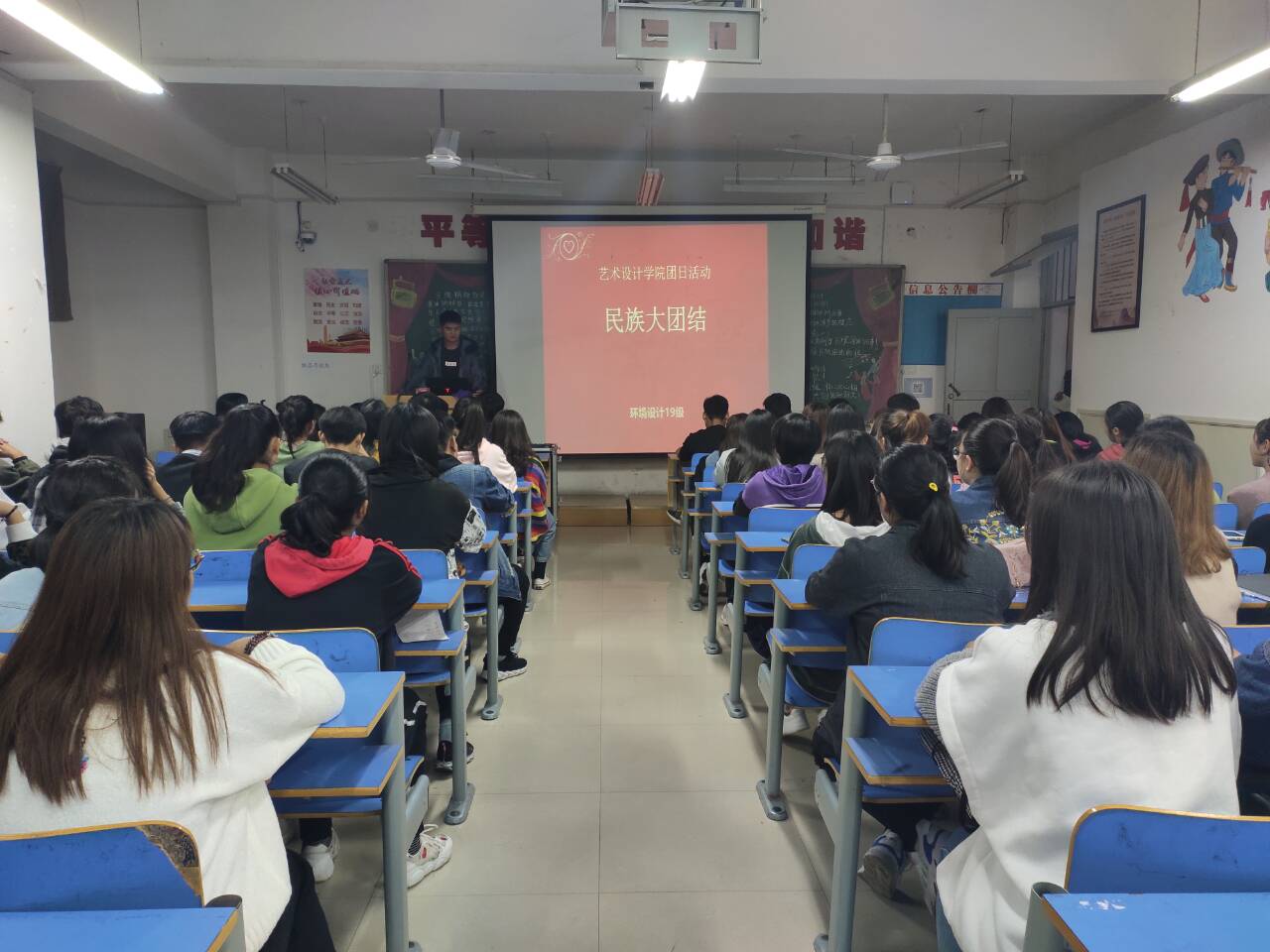 为全面落实党的教育方针,增强全体师生的中华民族共同体意识,共同建设和谐校园,以民族团结政治宣传月为契机,10月30日晚七点半,艺术设计学院在艺术楼505与309民族团结教室开展了以“民族大团结”为主题的团日活动。