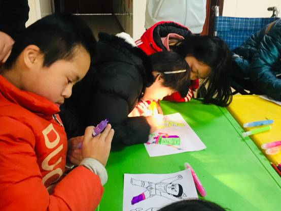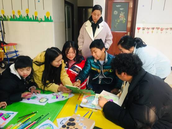 志愿者们在儿童福利院老师的帮助下,利用专业特长为小朋友上了一堂别开生面的美术课,志愿者与残障小孩简单互动交流,了解他们的爱好特长以及内心想法,手把手教学,与小朋友们一起绘画学习,通过画纸和画笔把他们的奇思妙想,天马行空的想象跃然纸上,整个过程温馨又和谐。志愿者用绘画打开了自闭小朋友的心扉,用双手放飞孩子们的梦想。
