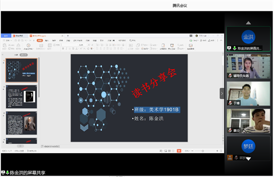 为辅助同学们扎实做好读书、思考、创新和创业,全面促进大学生成长成才,树立大学生读书、做事、做人有机统一的科学观念,艺术设计学院于2020年6月3日19:30-21:30借助“腾讯会议”网络平台开展了“艺沁书韵”线上读书分享会。艺术设计学院党总支副书记吴国华、学工办主任戚建永、学工办副主任蒋一鸣、2019级辅导员朱鸽和2018、2019级学生参加了此次分享会。