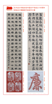 百年奋进,山河巨变;为庆祝中国共产党成立100周年、黄淮学院建校50周年,艺术设计学院特举办庆祝建党100周年招贴设计暨廉政作品创意大赛。活动于4月底启动,历时一个多月,收到在校学生作品、特邀校友作品、特邀教师作品等共计621件;类别涉及招贴、书法、篆刻、剪纸、绘画、雕塑、摄影等。作品通过“百年历程、红船精神、复兴之路、脱贫攻坚、党风廉政”等表现内容,讴歌中国共产党一百年来艰苦卓绝的奋斗精神。