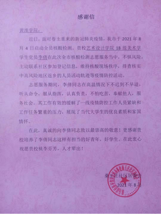 202184日到88日,李倩始终坚守在疫情防控第一线,帮助医护人员进行核酸检测信息登记,协助社区工作人员进行现场秩序维护,排查核实中高风险地区返乡人员的活动轨迹等疫情防控活动。有效的缓解了一线疫情防控工作人员紧缺和工作任务繁重的压力。