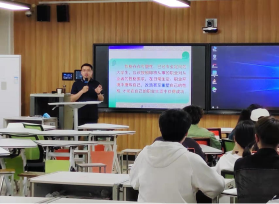 戚老师由“爱丽丝的故事”人生规划经典故事导入,告诉同学们职业规划的重要性,启发同学们对学业规划的思考。随后,通过霍兰德职业兴趣理论,让同学们从兴趣、性格两个方面去了解和认识自我,进一步就如何做好兴趣、性格与职业匹配,以及如何在实践中调适性格与同学们进行分享交流。最后,从职业规划设计的四个步骤:知己知彼、选择职业目标和路径、制定行动计划、反馈修正。就大学期间短期规划实践操作与同学们互动交流。
