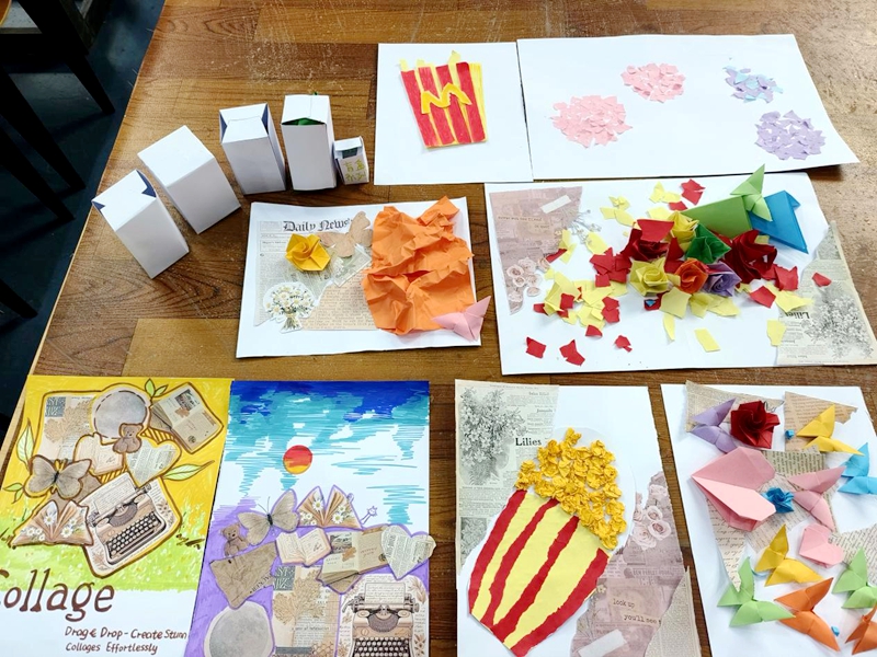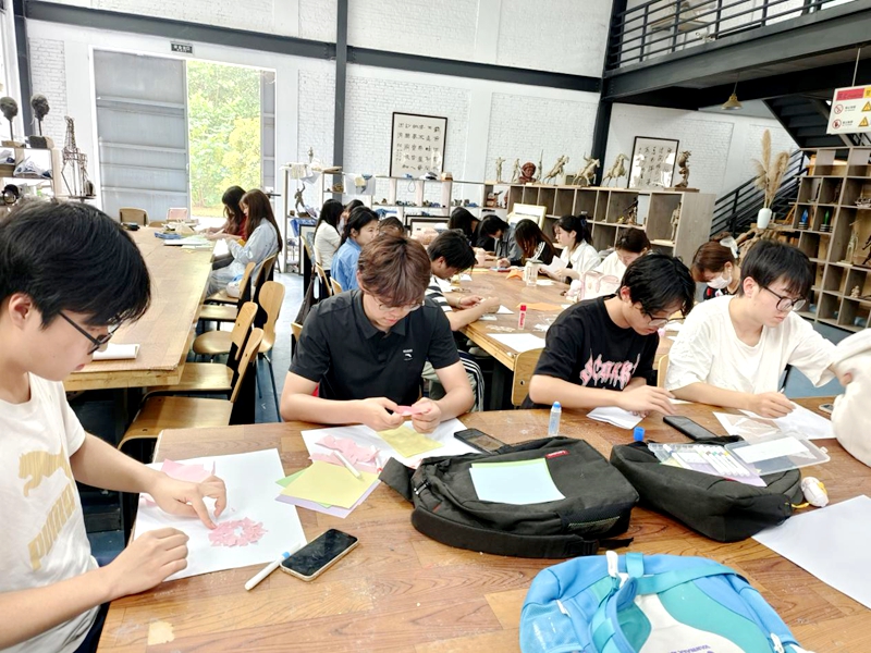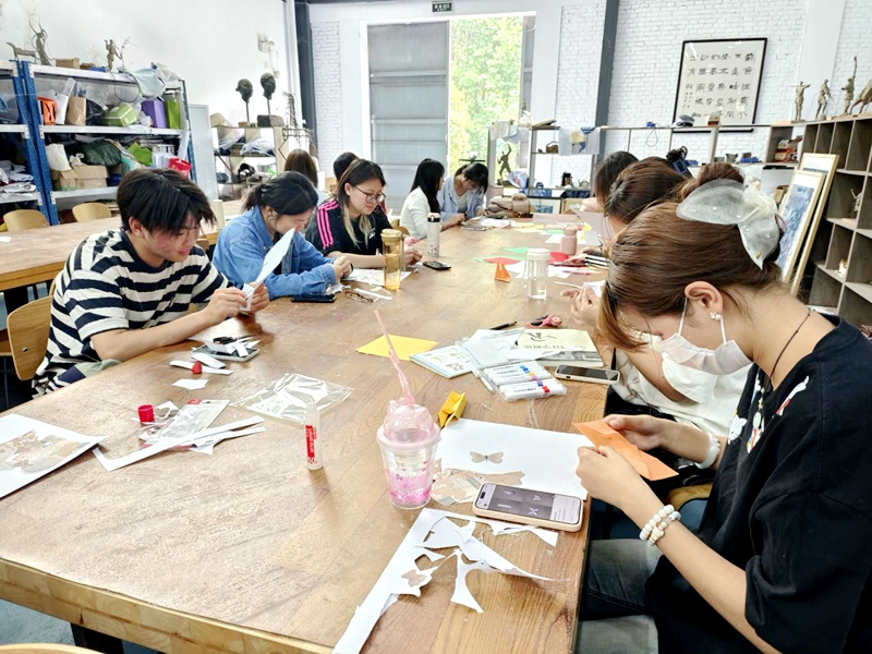 活动以“艺术疗愈”为核心,鼓励参与者以拼贴形式释放内心情感。现场提供废旧杂志、自然材料、织物碎片等多元化素材,学生通过自由裁剪、组合与重构,将抽象情绪转化为具象视觉作品,在触感与视觉的双重沉浸中,释放压力,唤醒积极情感。这个“化零为整”的过程,不仅是艺术创作的过程,更是心理韧性培养的过程。